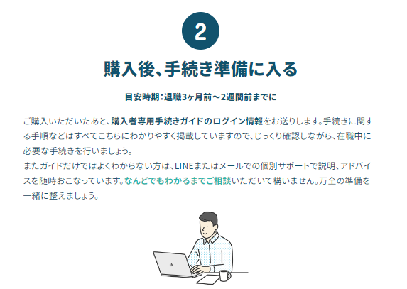 また、未来退職のサポート期限は購入より3年間としておりますので、半年前・1年前でも安心してご購入いただけます。