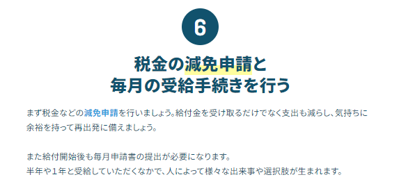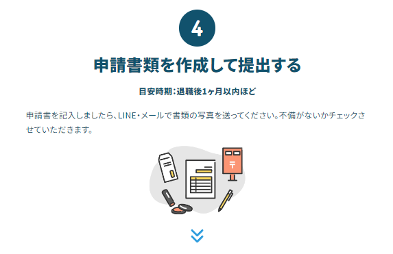 | 2 | 申請手続き | ドイコウヘイの退職相談窓口:未来退職でのサポートを得ずに、あなた自身で行うことも可能(ご自身で申請すると受給率は5%以下です。) |
